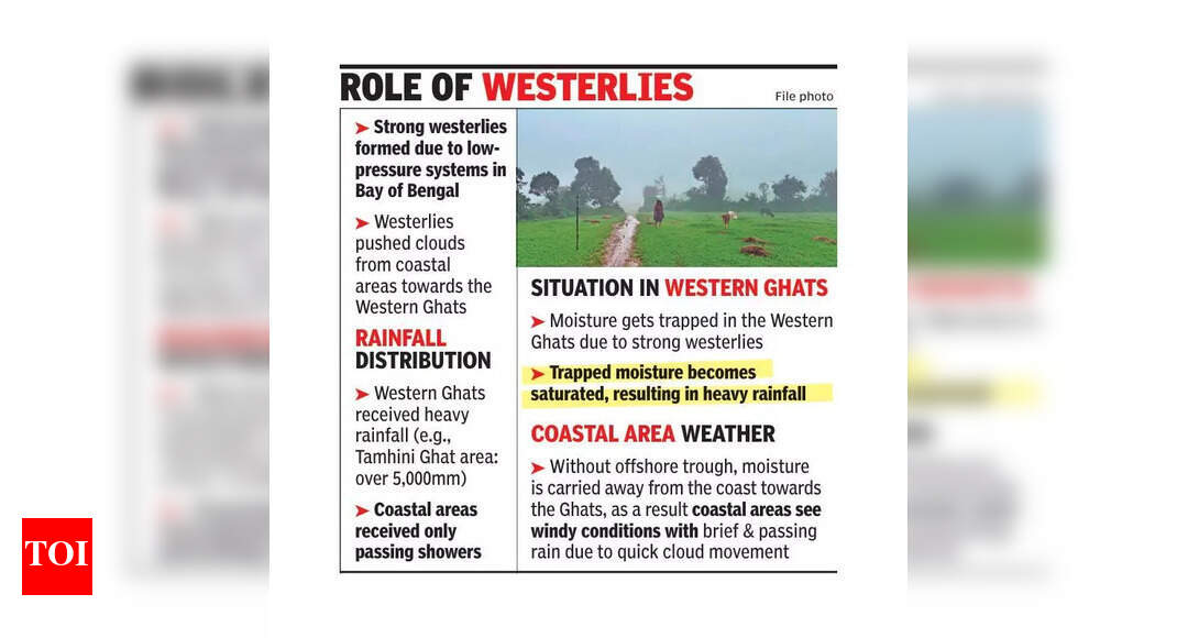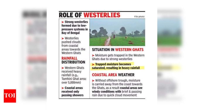 पुणे: महाराष्ट्रातील नुकत्याच झालेल्या पावसाळ्याच्या जादूमुळे मंगळवारपर्यंत पाऊस-कमतरता असलेल्या जिल्ह्यांना 20 वरून केवळ सहा वरून कमी झाले आहे. जवळपास घर, पुणे जिल्ह्यात या हंगामात पावसात 28% अधिशेष दिसून आला आहे.पावसाच्या तुटीला सामोरे जाणारे सहा जिल्ह्यांमध्ये मुंबई शहर (-22%), अहिलियानगर (-27%), बीड (-43%), हिंगोली (-34%), जलना (-27%) आणि लॅटूर (-20%) आहेत, आयएमडी डेटा दर्शविला आहे. यापैकी बहुतेक जिल्हे तीव्र पाणी-तणावग्रस्त मराठवाडा प्रदेशातील आहेत. सुरुवातीच्या हंगामातील कमतरतेचा त्रास झालेल्या विदर्भ आणि मराठवाडाच्या पूर्वेकडील प्रदेशांनी नागपूर (२०% जादा) आणि वार्ड (१०% अतिरिक्त) जिल्ह्यांसह तूट पासून सामान्य किंवा जादा श्रेणींमध्ये लक्षणीय सुधारणा दर्शविली आहे. मराठवाडामध्ये बीड सारख्या काही जिल्ह्यांमध्ये हिंगोली, जालना आणि लातूर या तूट क्षेत्रात आहेत, जूनच्या उत्तरार्धातील परिस्थितीच्या तुलनेत एकूण परिस्थिती लक्षणीय प्रमाणात सुधारली आहे.राज्यात एकूणच सुधारणा दिसून येताच, पारंपारिकपणे पावसाने समृद्ध कोकण कोस्टमध्ये सबपर जुलै पावसाचा साक्षीदार आहे, मुंबई उपनगरीने 3% कमतरता दर्शविली आहे. रत्नागीरीकडे एक सामान्य 1% अतिरिक्त आहे आणि रायगड सारख्या क्षेत्रामध्ये अगदी केवळ 7% जास्त प्रमाणात दिसून येते, तर सिंधुदुर्गमध्ये 5% हंगामी पावसाची कमतरता दिसून येते.स्वतंत्र हवामान तज्ज्ञ अभिजित मोडक म्हणाले, “जूनमध्ये कोंकणला जास्त पाऊस पडला, परंतु जुलैच्या तुलनेत जेव्हा पाऊस महिन्याच्या सामान्यच्या खालच्या बाजूला होता. यामुळे काही कोकण स्थानके सामान्य पाऊस खाली उतरली आहेत. मुंबई शहर, विशेषत: कोलाबा क्षेत्र आणि आसपासचे भाग आता एक कमतरता दर्शवित आहेत.”मोडक म्हणाले, “यावेळी, किना .्याला पुरेसा पाऊस पडला नाही. जुलैला ज्या प्रकारचा पाऊस पडला पाहिजे त्याचा अनुभव आला नाही.”हवामान तज्ञाने हे विशिष्ट वातावरणीय गतिशीलतेला दिले. “या प्रदेशात पाऊस आणणार्या दोन प्रकारच्या प्रणाली आहेत. एक प्रणाली बंगालच्या उपसागरापासून उद्भवली आहे, तर आम्हाला अरबी समुद्राकडून आर्द्रतेचे इनपुट प्राप्त होते. अरबी समुद्रात, किना along ्यावरील किनारपट्टीच्या किनारपट्टीवर, केरळपर्यंतचा एक किनारपट्टी आहे, जे सामान्यत: किनारपट्टीच्या भागात मुसळधार पावसात आणतात,” ते म्हणाले.यावेळी, बंगालच्या उपसागरात कमी-दाब प्रणाली तयार झाल्यावर वेस्टरली बळकट झाली. “या मजबूत वेस्टर्लीमुळे, किनारपट्टीच्या भागात तयार होणारे ढग पश्चिम घाटांकडे त्वरेने ढकलले गेले आहेत. परिणामी, आम्हाला फक्त किनारपट्टीच्या भागात पाऊस पडला, तर पश्चिम घाटांना मुसळधार पाऊस पडला आहे, ज्याचा पुरावा तमिहिनी घाट परिसरात झाला आ