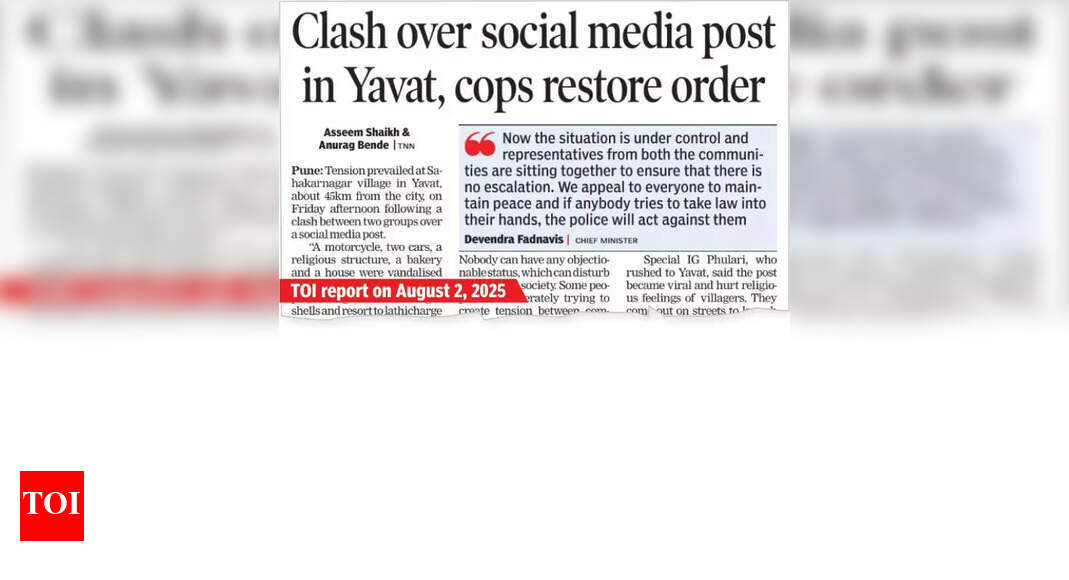 पुणे: वादग्रस्त सोशल मीडिया पोस्ट बनवणा the ्या तरुणांनी (२०) तब्बल १ people जणांना शनिवारी अटक करण्यात आली, शुक्रवारी दोन गटांमधील संघर्षानंतर शहरापासून सुमारे k 45 कि.मी.या संघर्षासंदर्भात १ 140० हून अधिक लोकांविरूद्ध पुणे ग्रामीण पोलिसांनी जाळपोळ, जातीय तणाव, दंगल आणि बेकायदेशीर असेंब्लीशी संबंधित एकूण पाच एफआयआर नोंदणी केली. पोलिस अधीक्षक (पुणे रूरल) संदीपसिंग गिल यांनी टीओआयला सांगितले की, “सहकारनगर व्हिलेज आणि युवातच्या बाहेरील वसाहतींमध्ये या गुन्हेगारीत निर्माण झालेल्या गुन्ह्यातील वैयक्तिक भूमिकांची पडताळणी केल्यानंतर दोन गटातील चार जणांना अटक करण्यात आलेल्या एकाधिक पोलिस पथकांनी आणि युवकाच्या सोशल मीडियाच्या पोस्टमध्ये या गुन्हेगारीच्या वैयक्तिक भूमिकांची पडताळणी केल्यानंतर दोन गटांना अटक केली.ते म्हणाले, “सध्या दौंड तालुकामध्ये राहणा Nand ्या नांडेडमधील तरुणांना पाचव्या एफआयआरमध्ये सोशल मीडिया पोस्टसाठी अटक करण्यात आली होती. आम्ही त्याला पोस्टमागील हेतू स्थापित करण्यासाठी त्याला प्रश्न विचारत आहोत.”दौंड मॅजिस्टरियल कोर्टाने 5 ऑगस्टपर्यंत पोलिसांच्या ताब्यात असलेल्या तरुणांना रिमांड केले. बाकीच्यांना 6 ऑगस्टपर्यंत पोलिसांच्या ताब्यात पाठविण्यात आले.शुक्रवारी मोटारसायकल, दोन कार, एक धार्मिक रचना, एक बेकरी आणि घराची तोडफोड केली गेली.गिल म्हणाले, “आम्ही सीसीटीव्ही कॅमेर्‍याच्या फुटेजचे विस्तृत विश्लेषण केले आहे, साक्षीदार आणि माहिती देणा from ्यांकडून माहिती गोळा केली आहे आणि गुन्ह्यात सहभागी असलेल्या जवळपास 35 ते 40 पुरुषांची ओळख स्थापित करण्यासाठी काही संकेतांवर काम केले आहे. शक्य तितक्या लवकर पोलिस पथकांना अटक करण्यासाठी. इतर अज्ञात लोकांची ओळख स्थापित करण्याची प्रक्रिया प्रगतीपथावर आहे.”ते म्हणाले, “सोशल मीडिया पोस्ट पूर्णपणे नियंत्रित झाल्यानंतर तणाव निर्माण करणारी कायदा व सुव्यवस्था परिस्थिती. कायदा व सुव्यवस्थेच्या परिस्थितीचा विचार केल्यावर रविवारी भारतीय नगरिक सुरक्षा संहिता यांच्या कलम १33 च्या तरतुदीनुसार जारी केलेल्या निषिद्ध आदेशाचा आढावा घेण्यात येईल. “एकूण २०० पोलिस, राज्य राखीव पोलिस दलाचे plol 75 कर्मचारी असलेले एक प्लाटून, प्रत्येकी १२ पोलिस आणि तीन दंगल नियंत्रण युनिट्स असलेले तीन धडक दल गावात आणि त्यातील बाह्य वसाहती प्रतिबंधक उपाय म्हणून तैनात करण्यात आले होते, असे गिल यांनी सांगितले. ते म्हणाले की, गावक of ्यांच्या मनात आत्मविश्वास वाढवण्यासाठी पोलिसांनी एक मार्ग मोर्चा काढला आणि यावत भागात शांतता राखण्यासाठी त्यांच्याबरोबर स्प्लिंटर गटात बैठक घेतली.